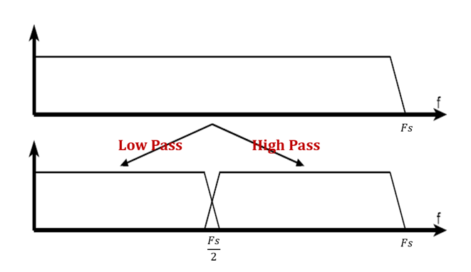 假设信号中的最高频率为 Fs 。那么,高通滤波器的作用就是得到( Fs/2 , Fs )的部分,低通滤波器的作用就是得到( 0 , Fs/2 )的部分。如下图所示:我们将这个过程称为一次半子带滤波。