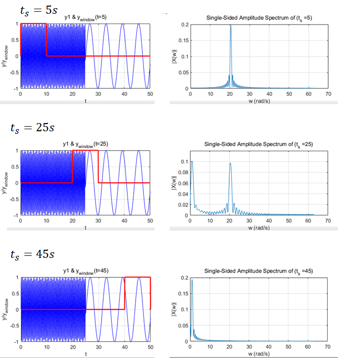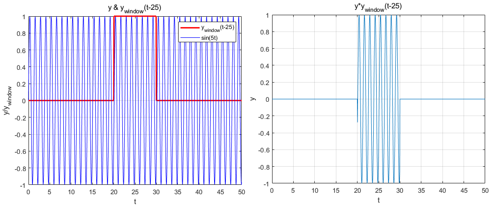 将信号划分成许多小的时间间隔,用傅里叶变换分析每一个时间间隔,以便确定该时间间隔存在的频率。我们定义一个中心宽度为width的窗函数窗函数除了中心宽度为width的部分为1外,其它部分都是0,这就相当于提取了原信号在 $ t=t_s $ 处,宽度为width的部分.
