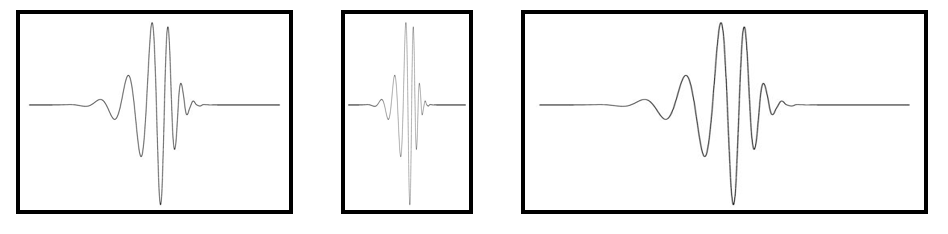 中间的图,s较小,相当于挤压,右侧的图,s较大,相当于拉伸。中间的图,s较小,相当于挤压,频率提高了;右侧的图,s较大,相当于拉伸,频率降低了。缩放就相当于改变频率。s越大,频率f越低,s, $f$ 是倒数关系。中间的图,s较小,相当于挤压,频率提高了,窗长变小了;右侧的图,s较大,相当于拉伸,频率降低了,窗长变大了。 这就可以实现我们需要的“低频,宽窗,差的时间分辨率,好的频域分辨率;高频,窄窗,好的时间分辨率,差的频域分辨率”。