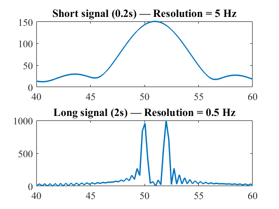 - The top subplot shows the FFT of the short signal — the two sine waves are not clearly separated.